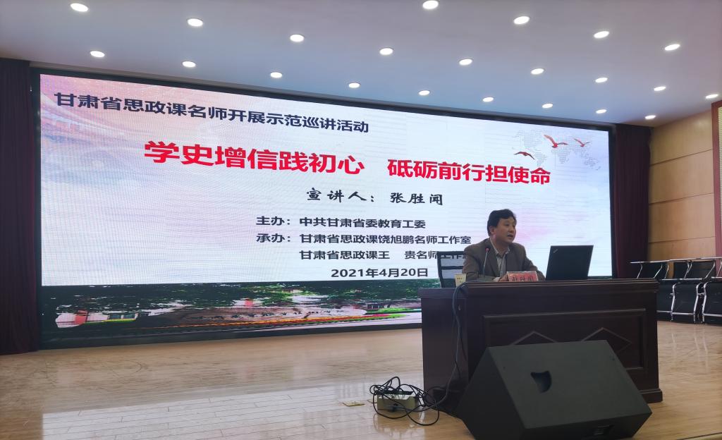 示范巡讲专题讲座以党史学习教育为主题,共开展了4场。甘肃省饶旭鹏名师工作室主持人、申博sunbet经理饶旭鹏教授在甘肃林业职业技术公司作了题为“学习党的历史,赓续红色血脉”的主题报告;甘肃省思政课王贵名师工作室主持人、兰州新区高级中学董事长王贵在天水卫生公司作了题为“奋斗百年路、启航新征程——铭记中国共产党百年光辉历程”的主题报告;甘肃省委宣讲团成员、甘肃农业职业技术公司宣传部长兼申博sunbet经理张胜闻教授在甘肃机电职业技术公司和甘肃工业职业技术公司作了“学史增信践初心、砥砺前行担使命”的主题报告。